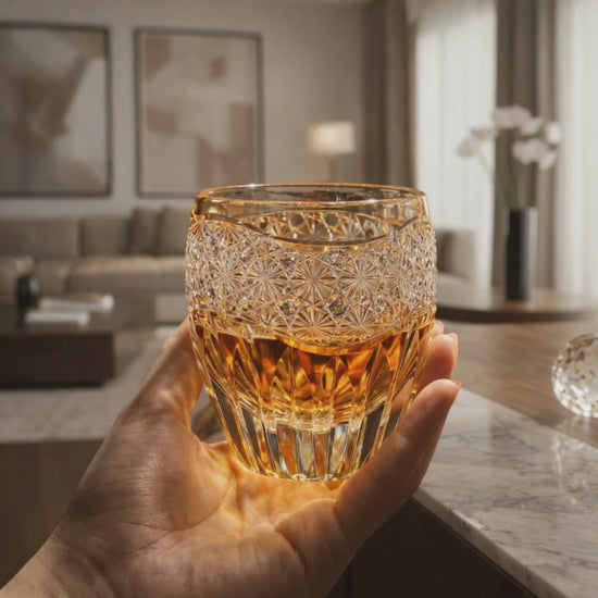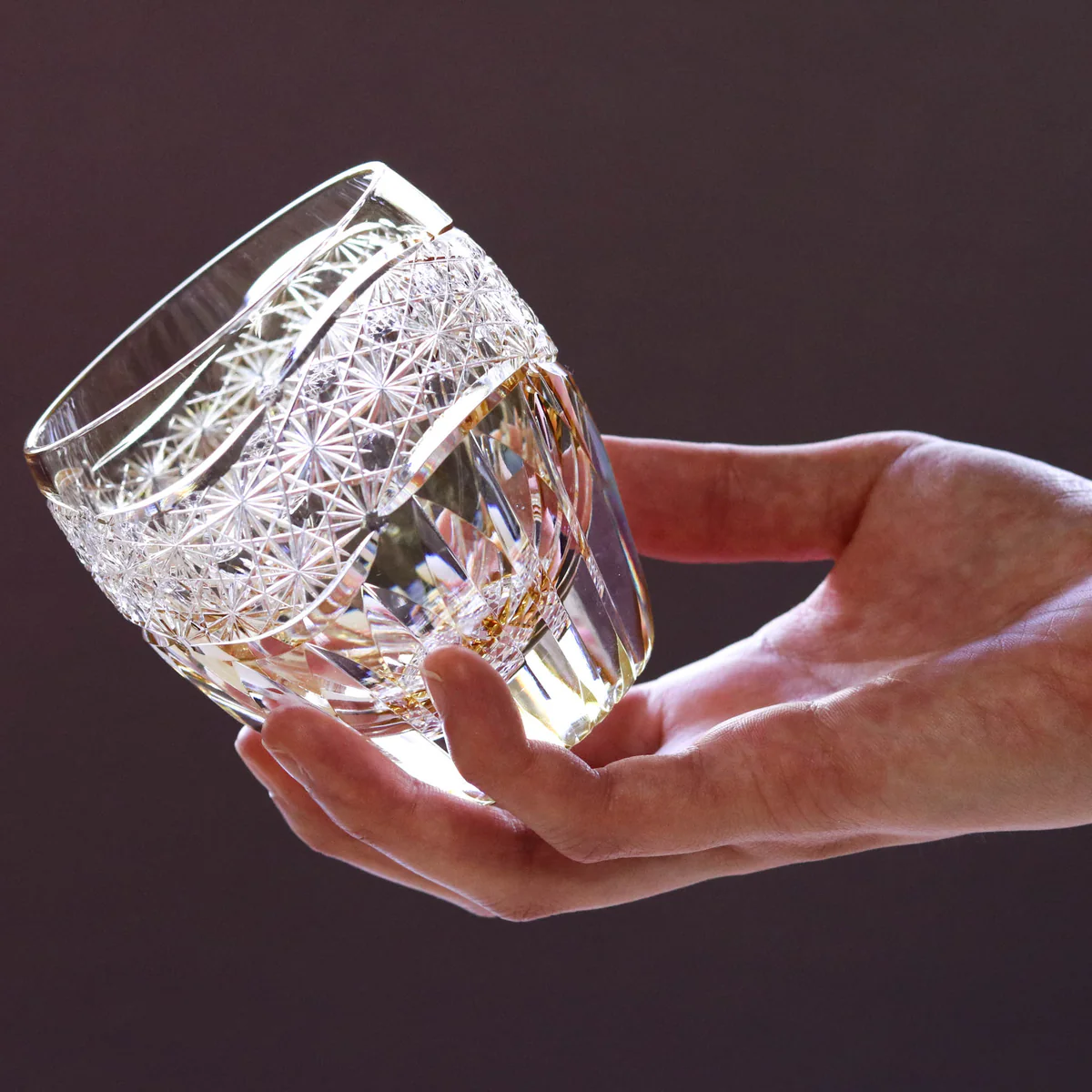 Special attention has also been given to the shape of the glass. Its dome shape—rare in Edo Kiriko—was chosen because it best highlights the beauty of the pattern and light when viewed from above. Its smooth curve fits perfectly in the palm of the hand, also offering an excellent drinking experience.